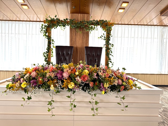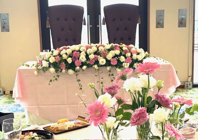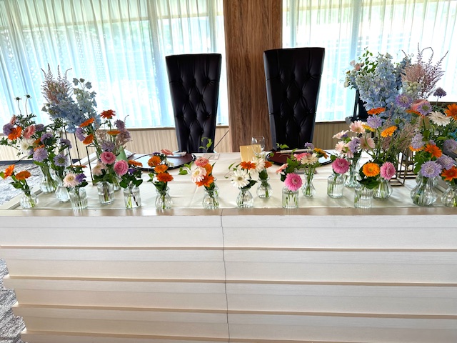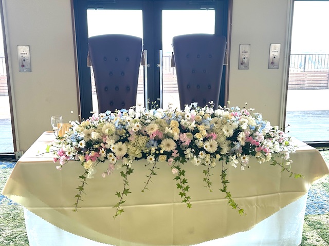 今日は新郎新婦お二人が座る高砂テーブルのお花をご紹介いたします♡